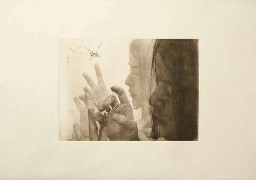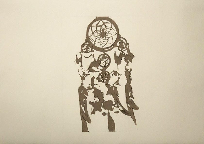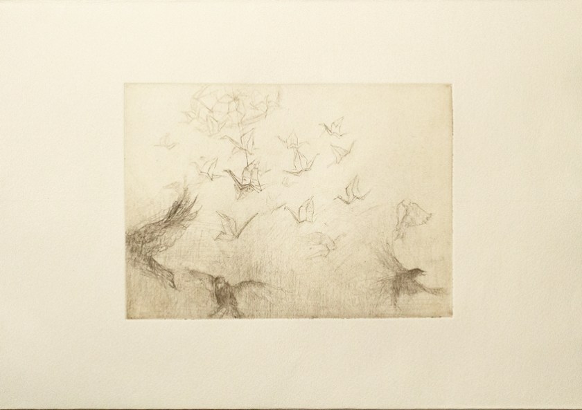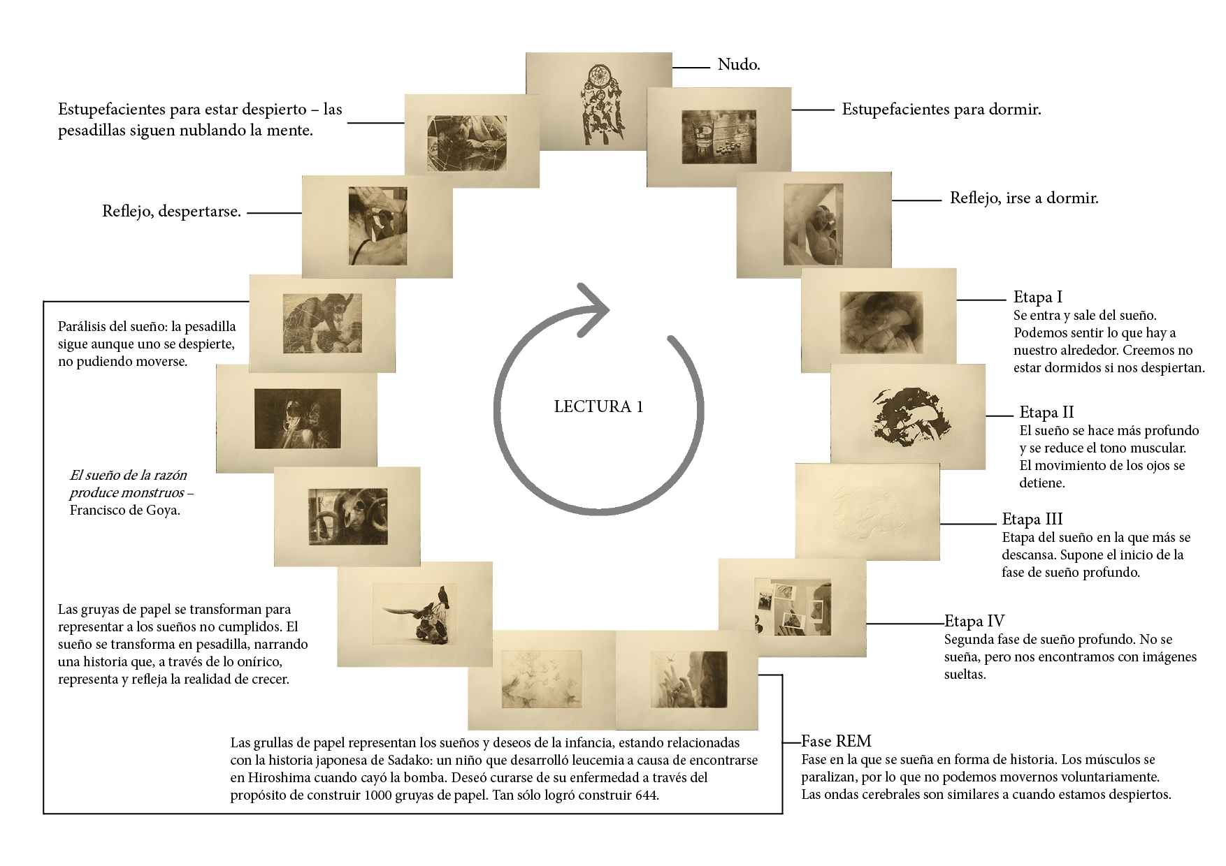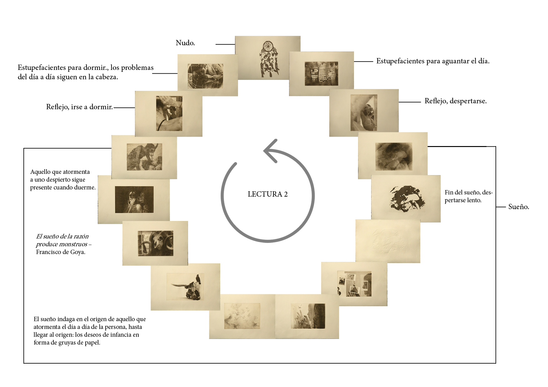 Dreamcatcher es un libro de artista cíclico que explora el mundo de los sueños. A través de su naturaleza simétrica adquiere una lectura bidireccional, cobrando sentido tanto si se lee en una dirección como en otra. Mientras que la lectura 1 explora las diferentes fases del sueño, la lectura 2 muestra cómo aquello que nos atormenta durante el día continúa estando presente en nuestros sueños, e indaga en el origen de estas pesadillas. Ambas lecturas generan un paralelismo entre la vida real y el mundo de los sueños: estupefacientes para poder dormir y para seguir despierto, las mismas obsesiones de día que de noche… Los sueños o deseos de infancia que inevitablemente acaban por no cumplirse en la vida real se transforman en pesadillas de noche a través de símbolos como gruyas de papel, cuervos, cráneos de cabra… La nana del ruiseñor acompaña a los grabados, sirviendo como hilo conductor entre estampas. En definitiva, se trata de una pieza que, a través de la sugerencia, alude a: